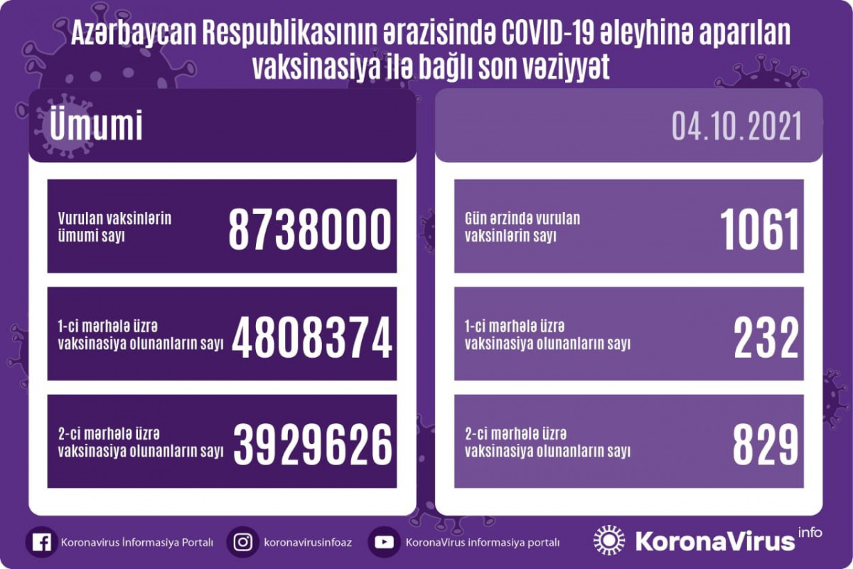 Ölkədə vurulan vaksinlərin ümumi sayı 8738000, birinci mərhələ üzrə vaksinasiya olunanların ümumi sayı 4808374, ikinci mərhələ üzrə vaksinasiya olunanların sayı isə 3929626 təşkil edir.