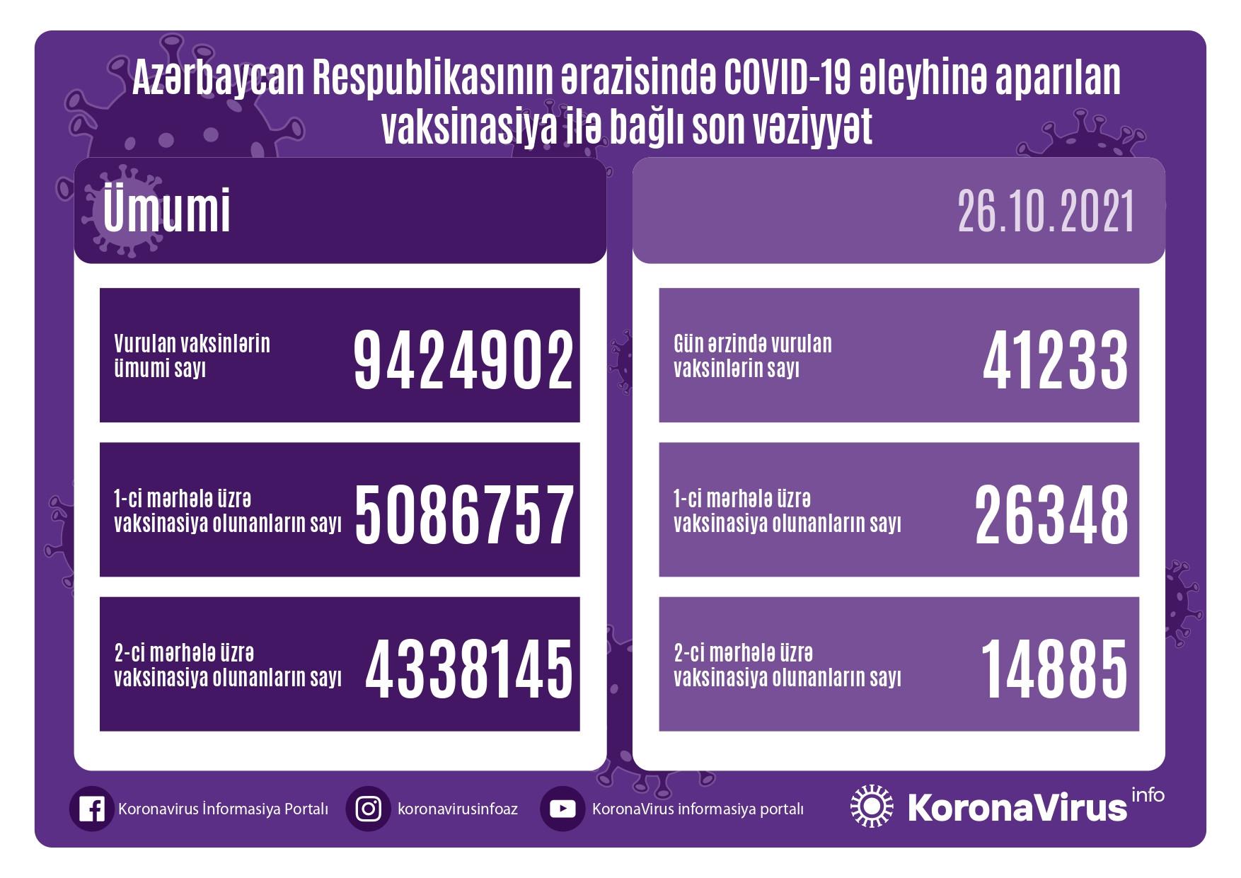 Ölkədə vurulan vaksinlərin ümumi sayı 9 424 902, birinci mərhələ üzrə vaksinasiya olunanların ümumi sayı 5 086 757, ikinci mərhələ üzrə vaksinasiya olunanların sayı isə 4 338 145 təşkil edir.