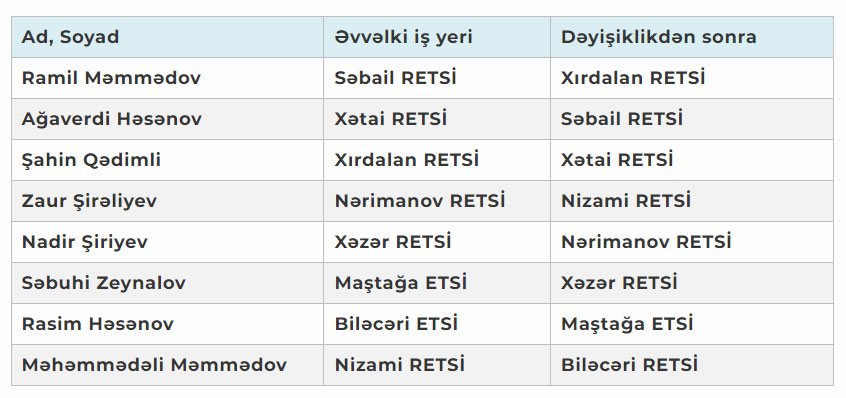 Yuxarıda qeyd olunanları nəzərə alaraq aşağıda göstərilən RETSİ (ETSİ) rəislərinin yerdəyişmələri aparılıb: