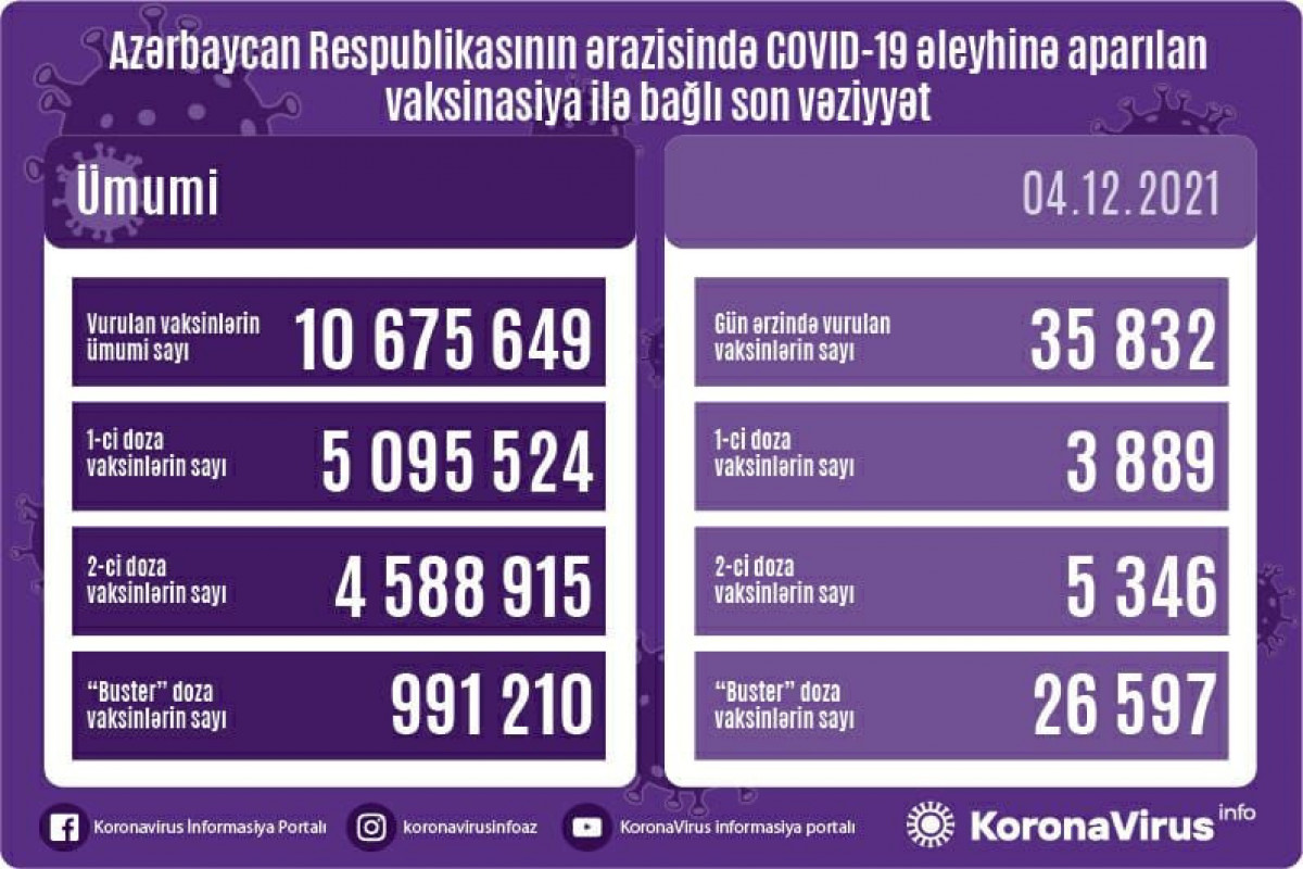 Azərbaycanda son sutkada koronavirus (COVID-19) əleyhinə 35832 vaksin vurulub. Bir gündə birinci mərhələ üzrə vaksinasiya olunanların sayı 3889, ikinci mərhələ üzrə vaksinasiya olunanların sayı 5346 , buster doza üzrə vaksinasiya olunanların sayı isə 26597 nəfərdir.