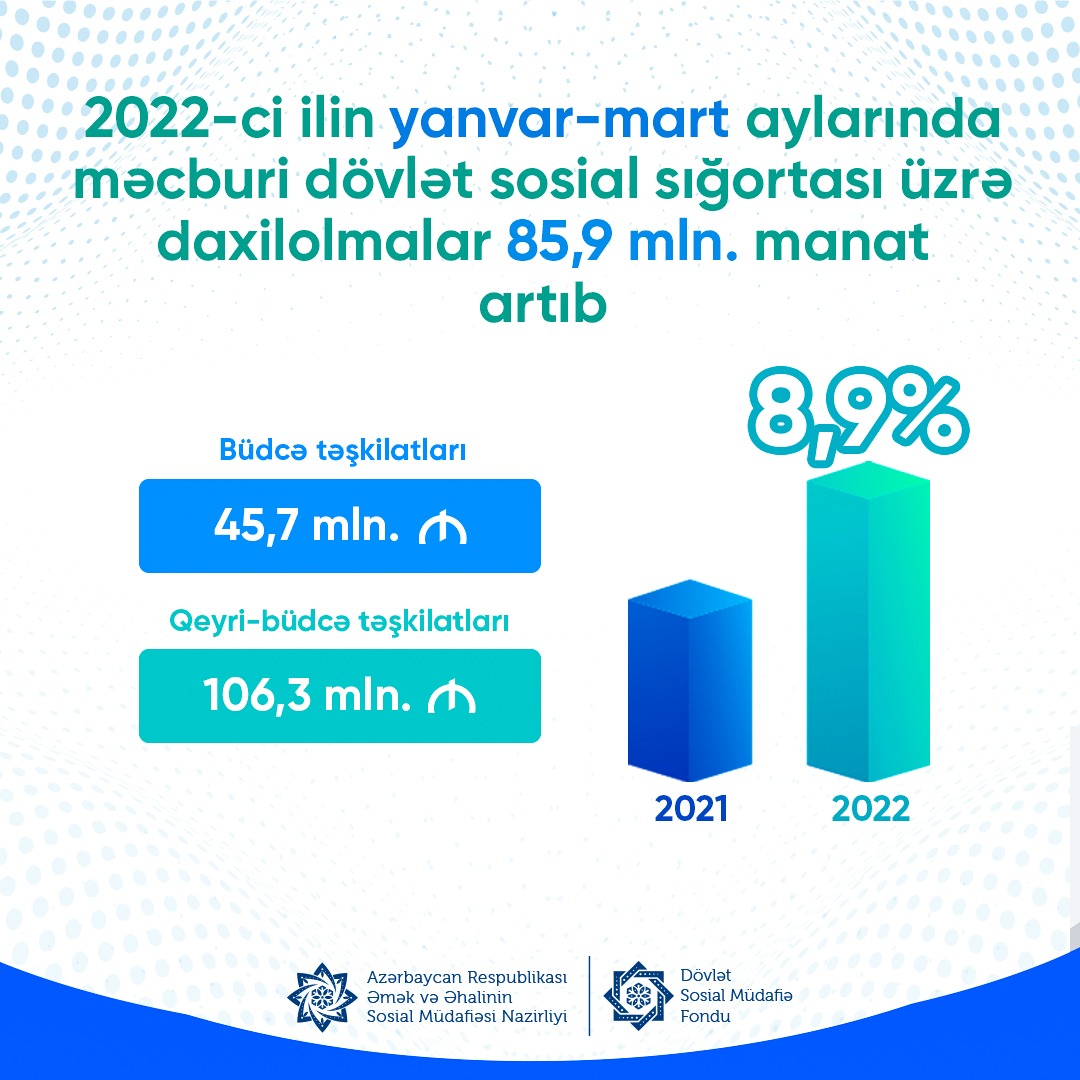 DSMF-nini yaydığı məlumata görə, büdcə təşkilatları üzrə daxilolma ötən ilin müvafiq dövrü ilə müqayisədə 45,7 mln. manat və ya 13,4%, qeyri-büdcə təşkilatları üzrə isə 106,3 mln. manat və ya 19,2% artımla olub.