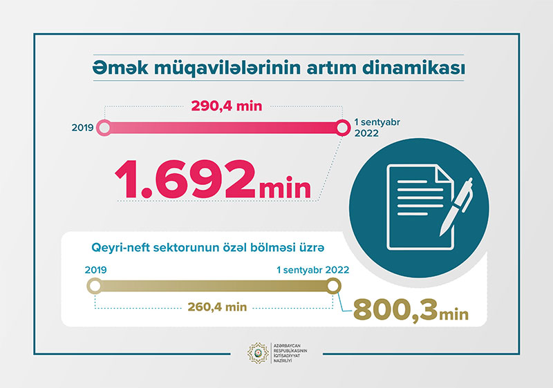 2019-cu ilin əvvəli ilə müqayisədə bağlanmış əmək müqavilələrinin sayı 290,4 min ədəd artıb və 2022-ci ilin 1 sentyabrına 1 milyon 692 mini ötüb.