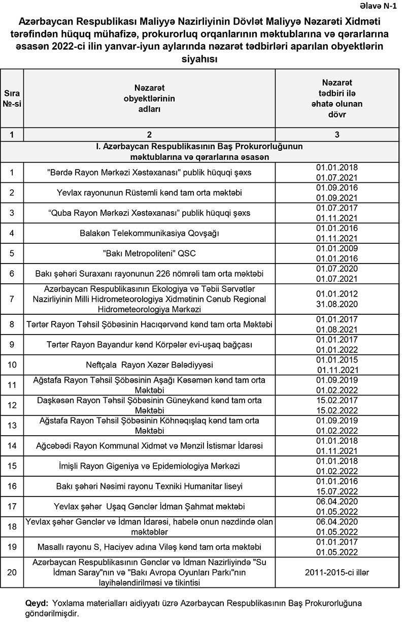 2022-ci ilin birinci yarısında Azərbaycan Respublikası Maliyyə Nazirliyinin Dövlət Maliyyə Nəzarəti Xidmətinin (Xidmət) mərkəzi aparatı və onun regional maliyyə müfəttişlikləri tərəfindən 52 təşkilatda (nəzarət obyektləri) aparılmış yoxlamalarla ümumilikdə 99 milyon 910,5 min manat məbləğində artıq və əsassız ödənişlər aşkar olunmuşdur.