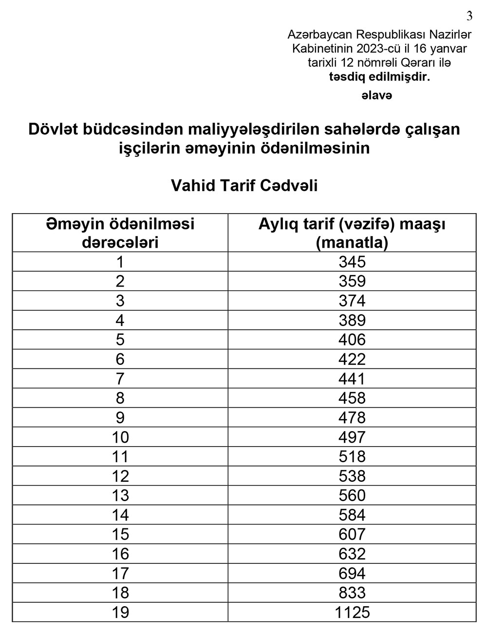 Qərara görə, dövlət büdcəsindən maliyyələşdirilən sahələrdə çalışan işçilərin əməyinin ödənilməsinin Vahid Tarif Cədvəli belədir: