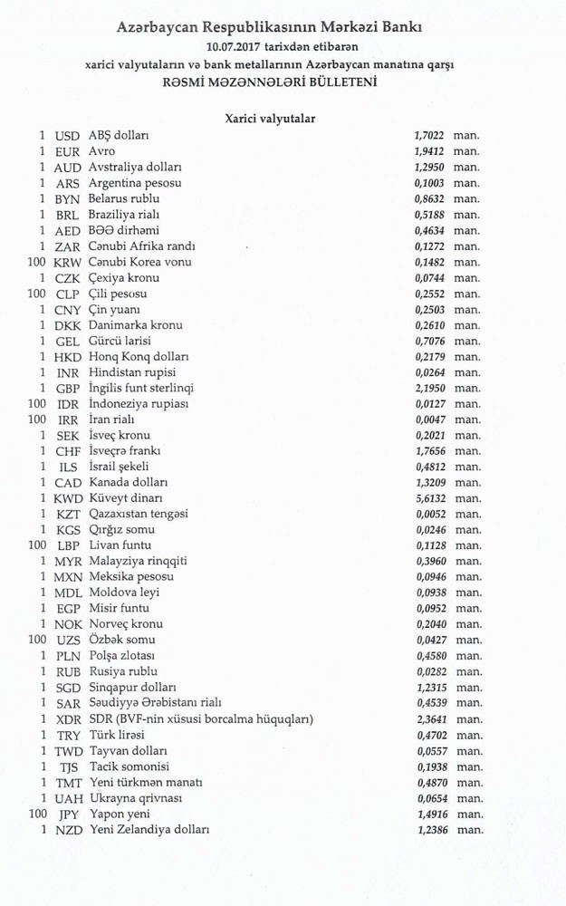Dolların bazar ertəsi üçün rəsmi məzənnəsi müəyyən olunub