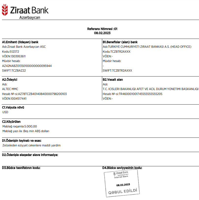 Tanınmış iş adamı Şamil Heyderovun təsisçisi və rəhbəri olduğu "Altis Group of Companies" və "Altec Aluminium" MMC şirkətləri Türkiyənin Fövqəladə Halların İdarə Olunması Agentliyinə (AFAD) 200.000 türk lirəsi (TL) məbləğində ianə edib.