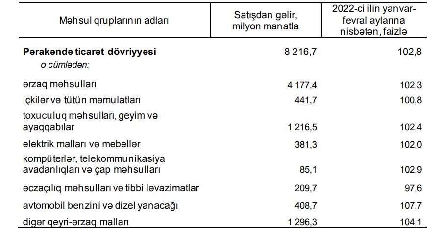 Dövlət Statistika Komitəsinin yaydığı məlumata görə, 2022-ci ilin yanvar-fevral ayları ilə müqayisədə pərakəndə ticarət dövriyyəsi real ifadədə 2,8 faiz, o cümlədən ərzaq məhsulları, içkilər və tütün məmulatları üzrə 2,2 faiz, qeyri-ərzaq malları üzrə 3,5 faiz artmışdır. Hesabat dövründə əmtəə bazarı aşağıdakı göstəricilərlə xarakterizə olunmuşdur: