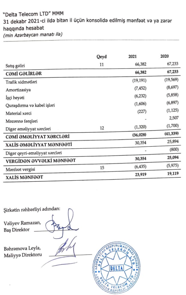 Belə ki, "Delta Telekom LTD" şirkətinin internet və digər xidmətlərdən gəlirləri 2020-ci ildəki 64 milyon 814 min manatdan 2021-ci ildə 65 milyon 851 manaat yüksəlib, avadanlığın satışından gəliri 2 milyon 131 min manatdan 206 min manata düşüb. Şirkət 2021-ci ildə icarədən 325 min manat gəlir əldə edib (2020-ci ildə 288 min manat).
