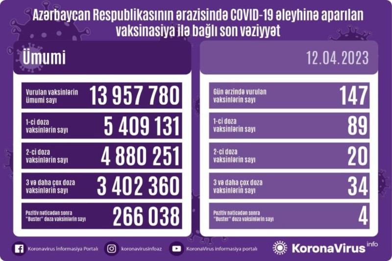 Azərbaycanda son sutkada koronavirus (COVID-19) əleyhinə 147 vaksin vurulub. Nazirlər Kabineti yanında Operativ Qərargahdan verilən məlumata görə, bir gündə birinci mərhələ üzrə vaksinasiya olunanların sayı 89, ikinci mərhələ üzrə vaksinasiya olunanların sayı 20, üç və daha çox doza üzrə vaksinasiya olunanların sayı 34, pozitiv nəticədən sonra buster doza üzrə vaksinasiya olunanların sayı 4 nəfərdir.