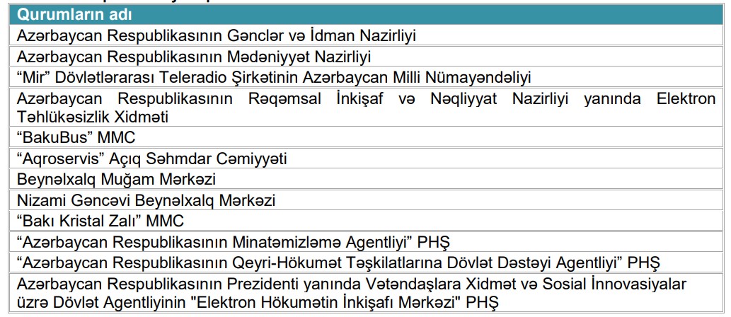 Qanunvericilikdə müəyyən edilmiş hesabat formalarını müvafiq tarixədək Hesablama Palatasına təqdim etməyən qurumlar: