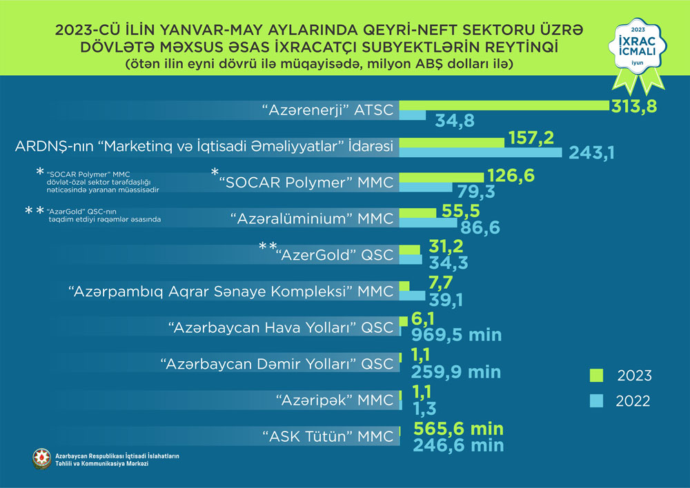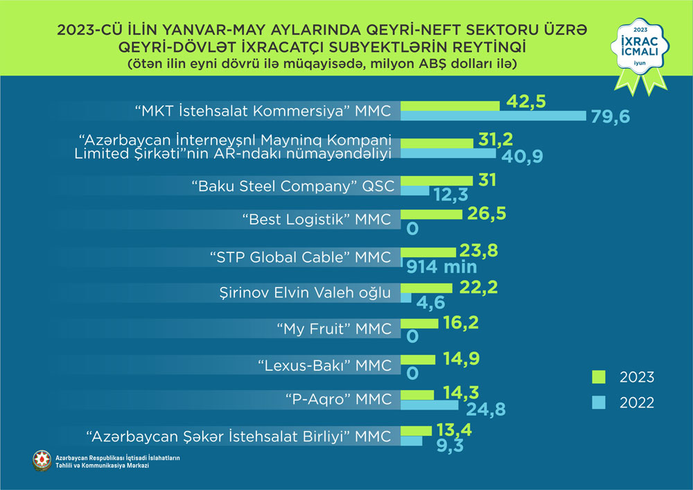 Marja.az xəbər verir ki, “İxrac icmalı”nda qeyri-neft sektoru üzrə 2023-cü ilin yanvar-may aylarında (ilk 5 ayda) həyata keçirilmiş ixracla bağlı həm qeyri-dövlət, həm də dövlətə məxsus ixracatçı subyektlərin reytinqi təqdim olunub.