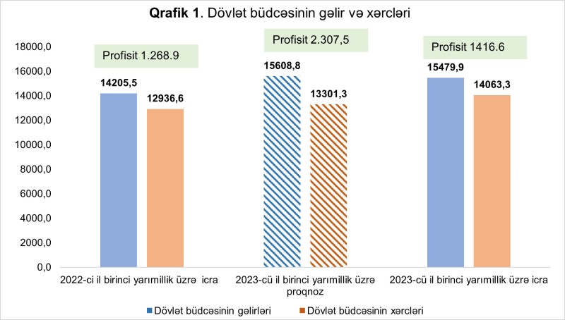 2023-ci ilin birinci yarımilliyində dövlət büdcəsinin gəlirləri 15479,9 milyon manat, xərcləri 14063,3 milyon manat olmuş, 1416,6 milyon manat məbləğində dövlət büdcəsinin artıqlığı (profisit) yaranmışdır ki, bu da 2022-ci ilin müvafiq dövrü ilə müqayisədə 147,7 milyon manat və ya 11,6 faiz çoxdur.