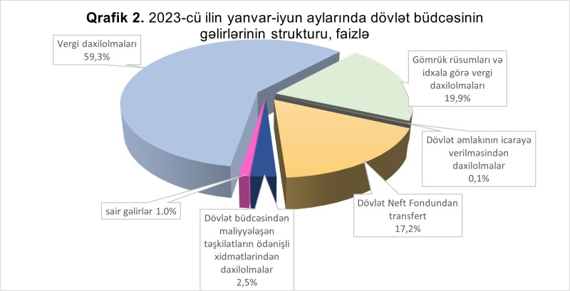 2023-cü ilin yanvar-iyun aylarında dövlət büdcəsinin daxilolmalarının 9181,4 milyon manatı və ya 59,3 faizi vergi daxilolmalarının, 3075,5 milyon manatı və ya 19,9 faizi gömrük rüsumları və idxala vergi daxilolmalarının, 2661,0 milyon manatı və ya 17,2 faizi Azərbaycan Respublikasının Dövlət Neft Fondundan dövlət büdcəsinə transfertin, 393,9 milyon manatı və ya 2,5 faizi dövlət büdcəsindən maliyyələşən təşkilatların ödənişli xidmətlərindən daxilolmaların, 16,0 milyon manatı və ya 0,1 faizi dövlət əmlakının icarəyə verilməsindən daxilolmaların, 152,1 milyon manatı və ya 1,0 faizi isə sair gəlirlərin payına düşmüşdür.