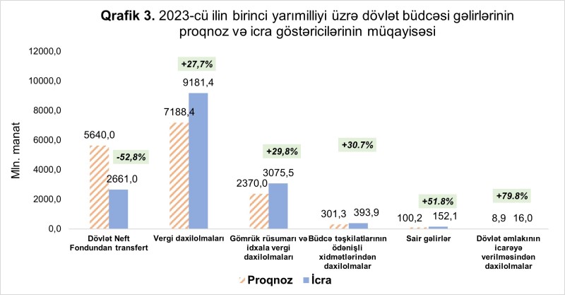 2023-cü ilin birinci yarımilliyi üzrə dövlət büdcəsinin gəlirləri 15608,8 milyon manat proqnoza qarşı 15479,9 milyon manat təşkil etmişdir ki, bu da proqnozla müqayisədə 128,9 milyon manat və ya 0,8 faiz az, 2022-ci ilin müvafiq dövrü ilə müqayisədə isə 9,0 faiz və ya 1274,4 milyon manat çoxdur.