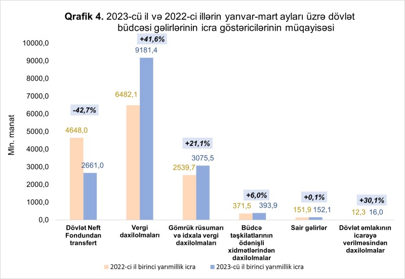 2023-cü ilin yanvar-iyun ayları üzrə dövlət büdcəsinin gəlirləri 2022-ci ilin müvafiq dövrü ilə müqayisədə vergi daxilolmaları üzrə 2699,3 milyon manat və ya 41,6 faiz, idxal gömrük vergi və rüsumları üzrə 535,8 milyon manat və ya 21,1 faiz, büdcə təşkilatlarının ödənişli xidmətlərindən daxilolmalar üzrə 22,4 milyon manat və ya 6,0 faiz, dövlət əmlakının icarəyə verilməsindən daxilolmalar üzrə 3,7 milyon manat və ya 30,1 faiz, sair gəlirlər üzrə 0,2 milyon manat və ya 0,1 faiz çox, Dövlət Neft Fondudan transfert üzrə isə 1987,0 milyon manat və ya 42,7 faiz az icra edilmişdir.