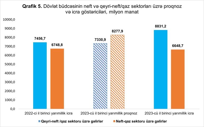 2023-cü ilin yanvar-iyun aylarında dövlət büdcəsinin gəlirlərində neft-qaz sektoru üzrə daxilolmaların 60,0 faizi və ya 3987,7 milyon manatı vergi daxilolmaları, 40,0 faizi və ya 2661,0 milyon manatı Azərbaycan Respublikasının Dövlət Neft Fondundan transfert təşkil edir. Neft-qaz sektoru vergi daxilolmalarının 66,0 faizi və 2630,4 milyon manatı Şahdəniz qaz-kondensat yatağı üzrə mənfəət vergisi, 24,9 faizi və ya 992,5 milyon manatı Dövlət Neft Şirkətinin ödədiyi müvafiq vergilər, 9,1 faizi və ya 364,8 milyon manatı Azəri-Çıraq-Günəşli neft yatağı üzrə mənfəət vergisi təşkil edir.