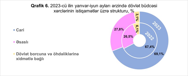 2023-cü ilin yanvar-iyun ayları ərzində dövlət büdcəsi xərclərinin 9718,8 milyon manatı və ya 69,1 faizi cari xərclərə, 3913,7 milyon manatı və ya 27,8 faizi əsaslı xərclərə, 430,8 milyon manatı və ya 3,1 faizi dövlət borcuna və öhdəliklərinə xidmətlə bağlı xərclərə yönəldilmişdir.