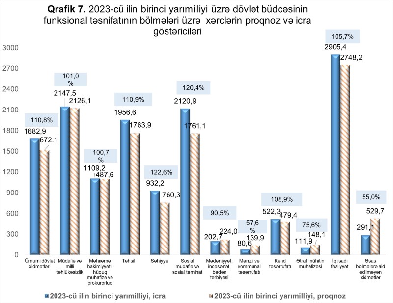 2023-cü ilin yanvar-iyun aylarında dövlət büdcəsinin funksional təsnifatına görə səhiyyə xərcləri 122,6 faiz icra edilməklə 932,2 milyon manat, sosial müdafiə və sosial təminat xərcləri 120,4 faiz icra edilməklə 2120,9 milyon manat, təhsil xərcləri 110,9 faiz icra edilməklə 1956,6 milyon manat, ümumi dövlət xidmətləri xərcləri 110,8 faiz icra edilməklə 1682,9 milyon manat, kənd təsərrüfatı xərcləri 108,9 faiz icra edilməklə 522,3 milyon manat, iqtisadi fəaliyyət xərcləri 105,7 faiz icra edilməklə 2905,4 milyon manat, müdafiə və milli təhlükəsizlik xərcləri 101,0 faiz icra edilməklə 2147,5 milyon manat, məhkəmə hakimiyyəti, hüquq-mühafizə və prokurorluq bölməsi üzrə xərcləri 100,7 faiz icra edilməklə 1109,2 milyon manat, mədəniyyət, incəsənət, informasiya, bədən tərbiyəsi, gənclər siyasəti və bu qəbildən olan digər fəaliyyət xərcləri 90,5 faiz icra edilməklə 202,7 milyon manat, ətraf mühitin mühafizəsi xərcləri 75,6 faiz icra edilməklə 111,9 milyon manat, mənzil və kommunal təsərrüfatı xərcləri 57,6 faiz icra edilməklə 80,6 milyon manat, əsas bölmələrə aid edilməyən xidmətlər bölməsi üzrə xərcləri 55,0 faiz icra edilərək 291,1 milyon manat təşkil etmişdir.