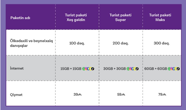 Tariflər barədə ətraflı məlumatı https://bit.ly/tourist-pack ünvanında əldə etmək olar.
