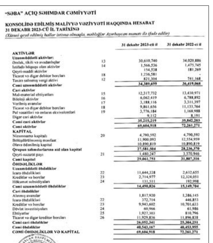 "Səba" ASC 2023-cü ili 2 milyon 345 min manat xalis zərər ilə başa vurub. Şirkət 2022-ci ili 14 milyon 378 min manat xalis mənfəət ilə bağlamışdı.