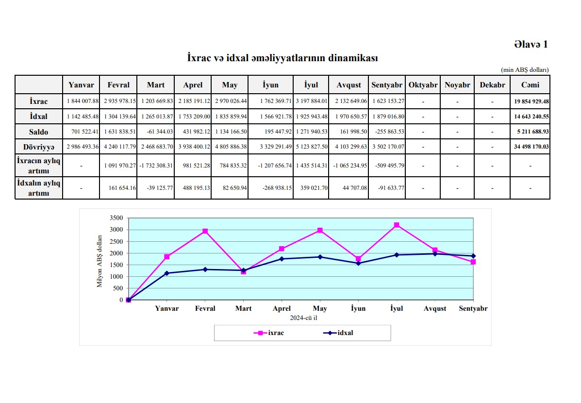 2024-cü ilin sentyabr ayında Azərbaycanın ixracı 1 milyard 623 milyon 153 min dollar, idxalı 1 milyard 879 milyon 17 idxal min dollar, saldo mənfi 255 milyon 863 min dollar təşkil edib.