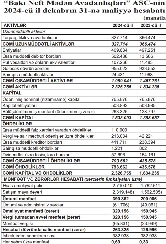 31 dekabr 2024-cü il tarixində “Bakı Neft Mədən Avadanlıqları” ASC 2 milyon 327 min manat cəmi aktivlərə malik olub. ASC 2023-cü ilin sonunda 1 milyon 834 min manat cəmi aktivlərə malik idi.