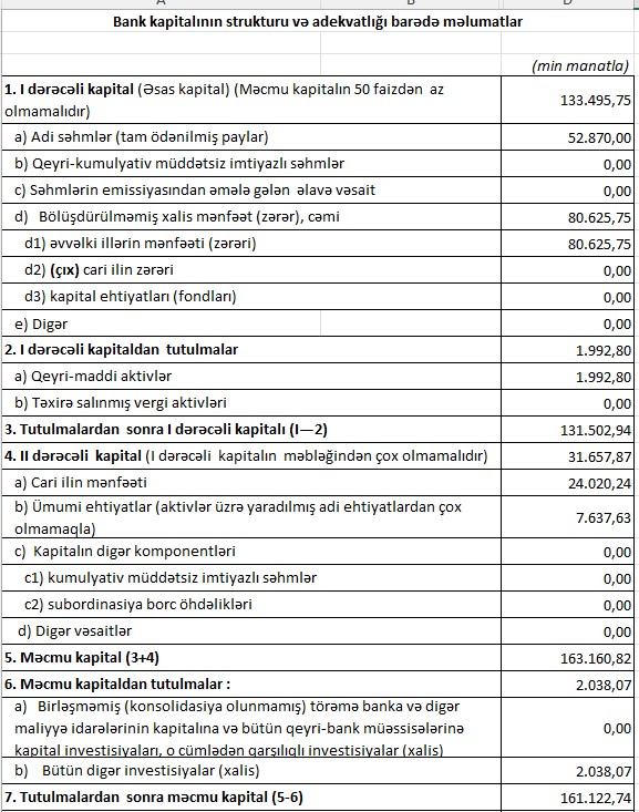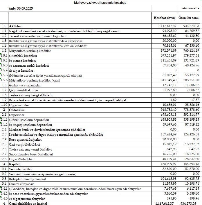 Bankın məcmu kapitalı 30 sentyabr 2025-ci il tarixinə 161 milyon 123 min manat təşkil edib. 2024-cü ilin sonundakı 151 milyon 103 min manat göstəricisinə nisbətən 6,6% artım müşahidə olunub.