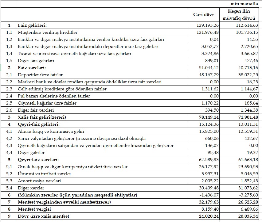 Bankın qeyri-faiz gəlirləri 15 milyon 124 min manat səviyyəsində olub, ötən ilin 13 milyon 11 min manatı ilə müqayisədə 16,2% artım göstərib. Qeyri-faiz xərcləri isə 62 milyon 590 min manat olub ki, bu da 2024-cü ilin 61 milyon 663 min manatı ilə müqayisədə 1,5% artım deməkdir.