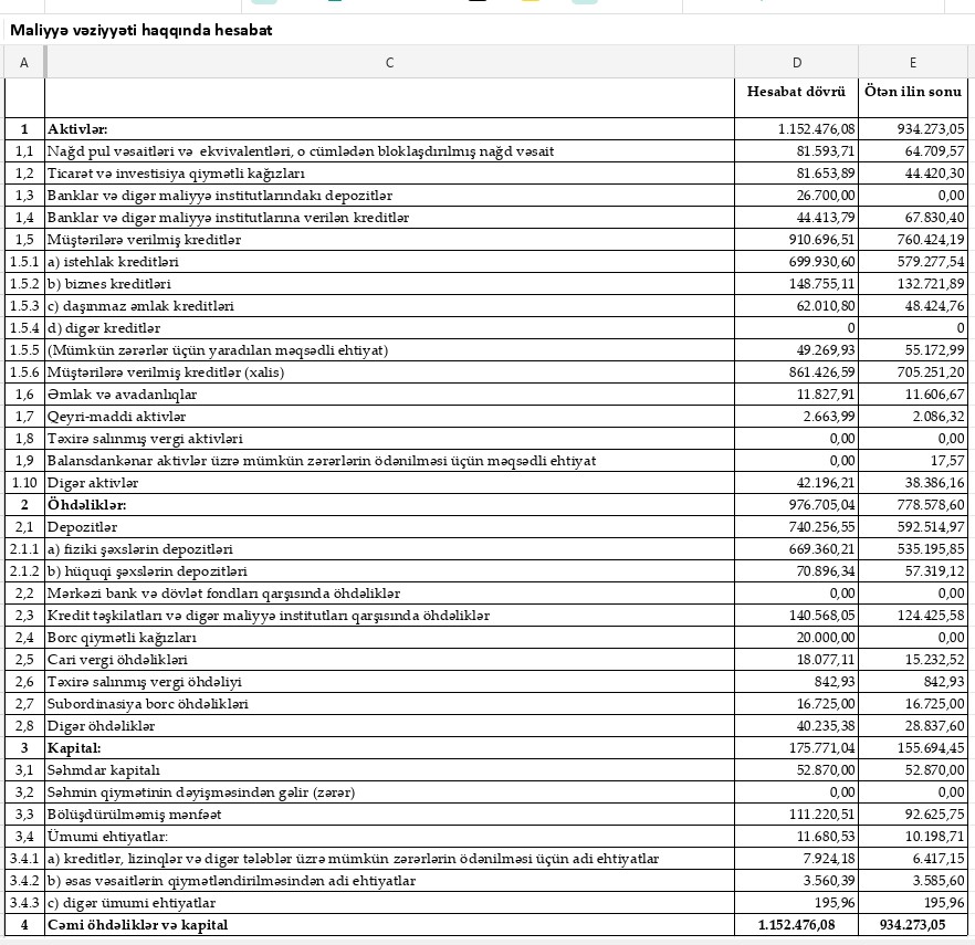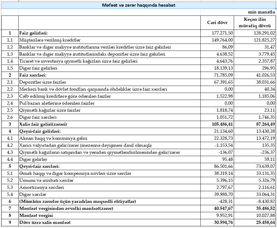 2025-ci ildə mümkün zərərlər üçün yaradılmış məqsədli ehtiyatlardan 428 min manat azad edilib. 2024-cü ildə isə bu istiqamətdə 8 milyon 431 min manat ayırma edilmişdi. Bu dəyişiklik kredit portfelinin keyfiyyətinin yaxşılaşdığını və risk yükünün azaldığını göstərir.