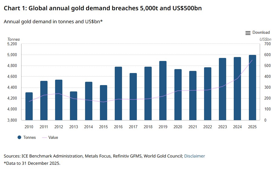 World Gold Council (WGC) tərəfindən yayımlanan “Gold Demand Trends: Q4 and Full Year 2025” hesabatına görə, qlobal qızıl tələbi 2025-ci ildə ilk dəfə 5000 ton səviyyəsini keçərək tarixi bir həddi aşıb. Hesabatda göstərilir ki, qlobal qızıl tələbi əsasən investisiya yönümlü artımın təsiri ilə rekord səviyyəyə çatıb. Qızıl ETF-ləri* və külçə-sikkə alışları ön plana çıxarkən, mərkəzi bankların alışları da yüksək səviyyəsini qoruyub.