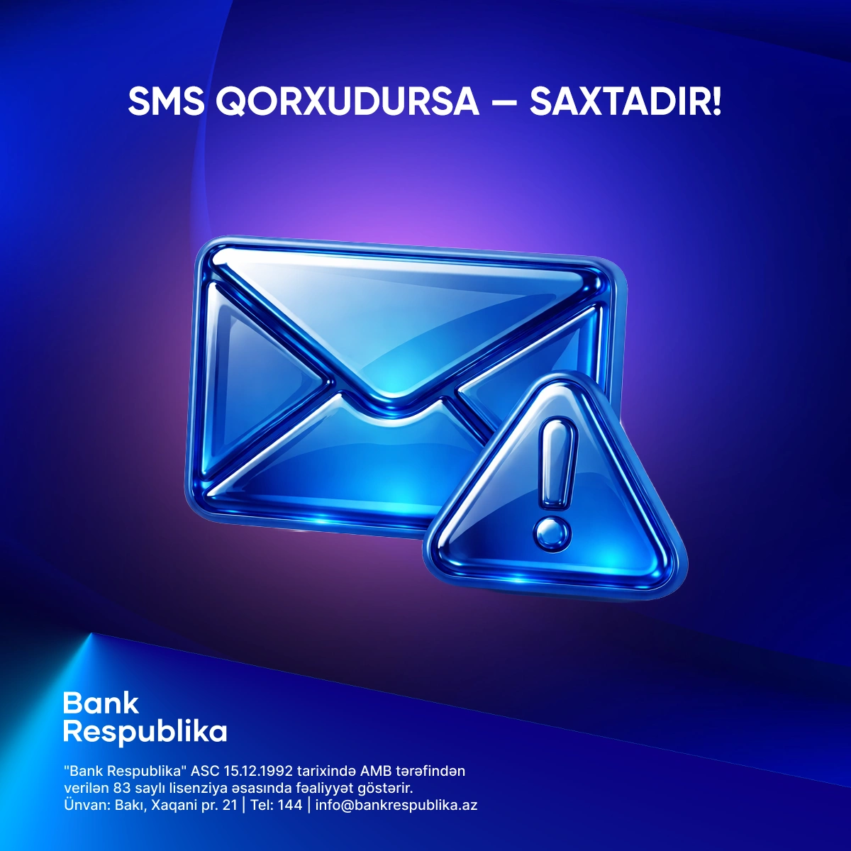 Bank Respublika heç bir halda müştərilərindən telefon, SMS, e-mail və ya sosial şəbəkələr vasitəsilə kartın məxfi məlumatlarını tələb etmir. Şübhəli vəziyyətlə qarşılaşdıqda əməliyyatı dərhal dayandırmaq və bankın rəsmi əlaqə kanalları ilə əlaqə saxlamaq tövsiyə olunur.