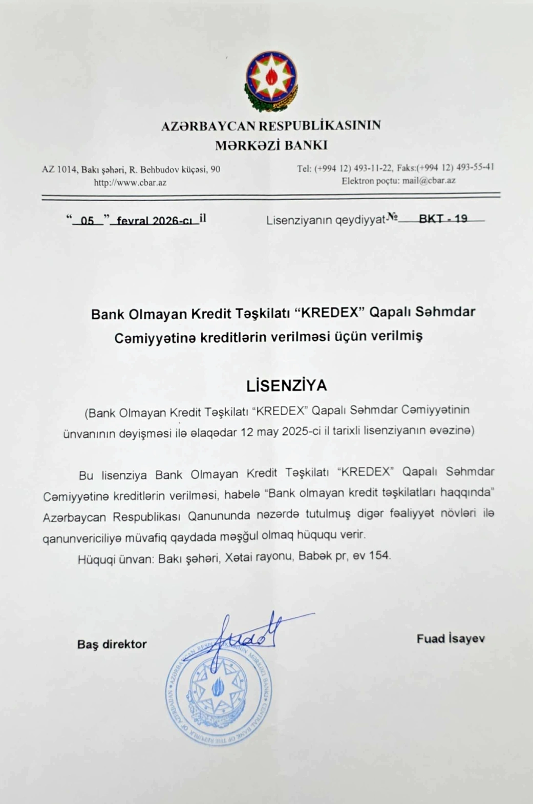 Azərbaycan Respublikası Mərkəzi Bankı, Bank Olmayan Kredit Təşkilatı “KREDEX” Qapalı Səhmdar Cəmiyyətinə "ünvanının dəyişməsi ilə əlaqədar" 12 may 2025-ci il tarixli lisenziyanın əvəzinə, 05 fevral 2026-cı il tarixli BKT-19 saylı lisenziya təqdim edib.