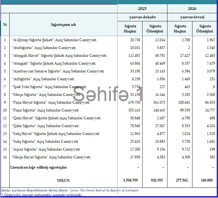 2026-cı ilin ilk 2 ayı ərzində (yanvar-fevral) Azərbaycanda fəaliyyət göstərən 16 sığorta şirkəti tərəfindən 277 milyon 562 min manat sığorta haqları hesablanıb, 148 milyon 800 min manat sığorta ödənişləri həyata keçirilib.