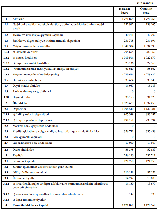 Eyni zamanda kapitalın artması, pərakəndə depozitlərin genişlənməsi və kredit portfelinin sabit böyüməsi bankın maliyyə dayanıqlığının qorunduğunu göstərir. Bununla yanaşı, hüquqi şəxslərin depozitlərində azalma və maliyyə institutları qarşısında öhdəliklərin artması bankın maliyyə resurslarının strukturunda müəyyən dəyişikliklərin baş verdiyini göstərir.