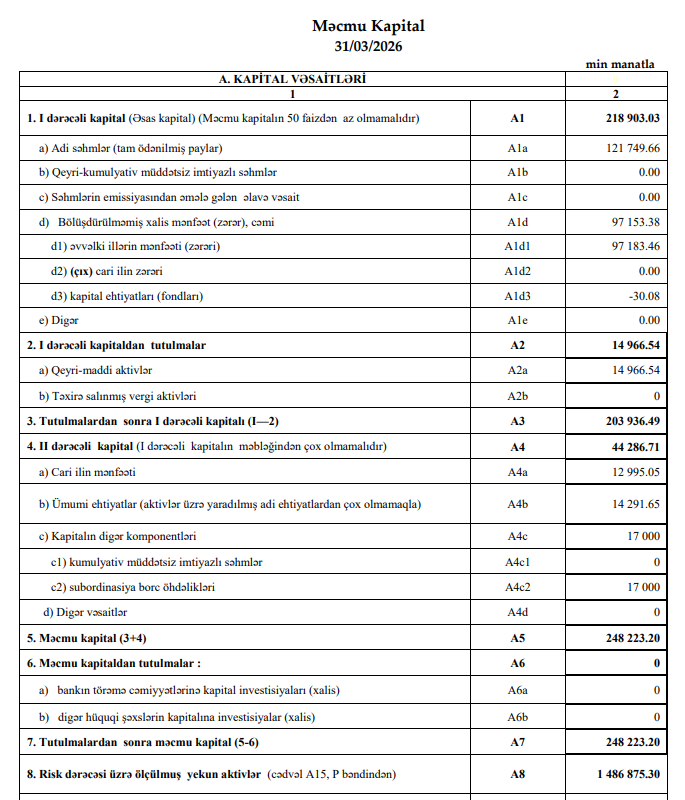 2026-cı ilin ilk rübünün sonuna "AccessBank"ın məcmu kapitalı 248 milyon 223 min manat təşkil edib. Bu göstərici 2025-ci ilin sonu ilə müqayisədə 13 milyon 825 min manat və ya 5,9 % artıb.