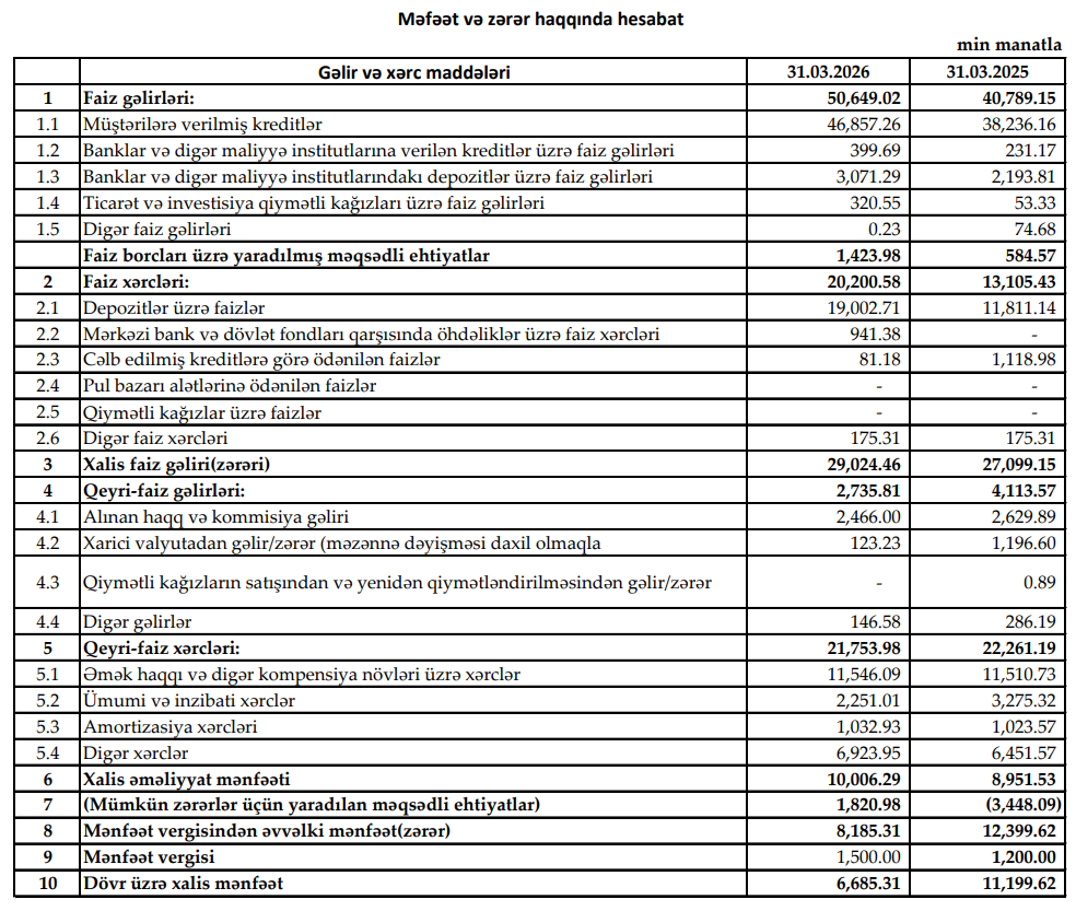 Bank 2025-ci ilin ilk rübünü 11 milyon 200 min manat xalis mənfəət ilə bağlamışdı.