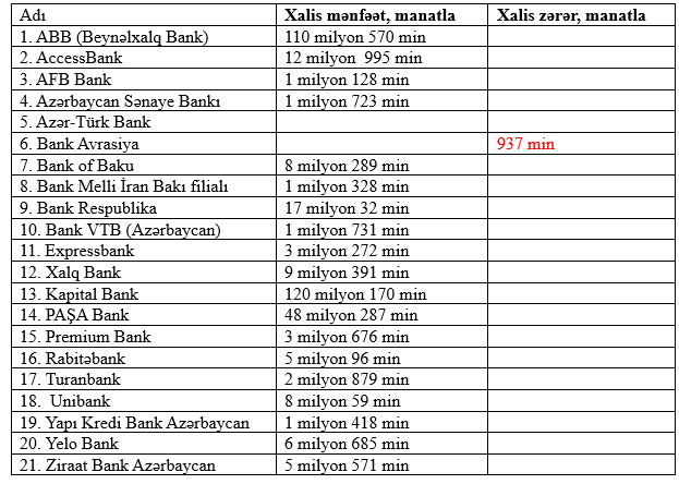 19 bank xalis mənfəət, 1 bank xalis zərər açıqladı - SİYAHI