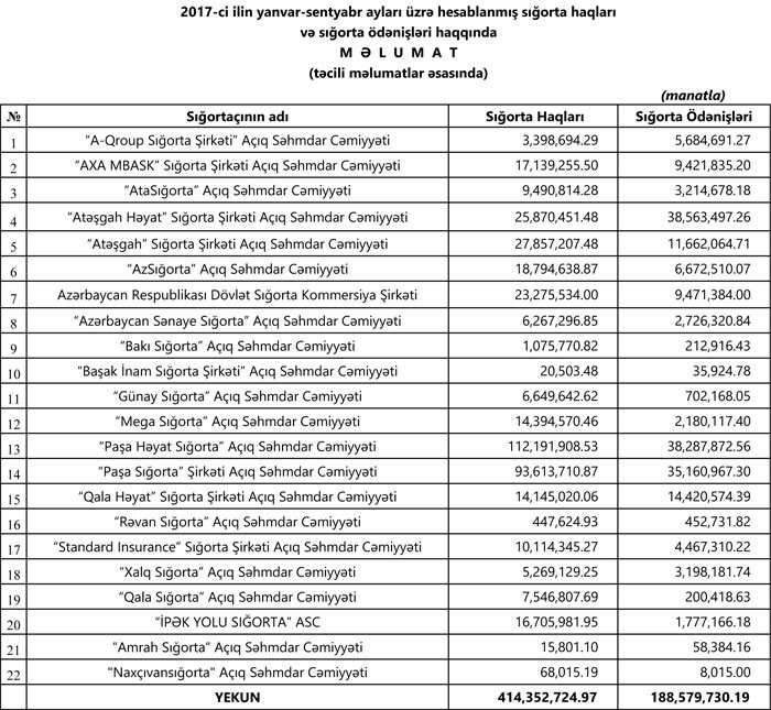 2017-ci ilin yanvar-sentyabr ayları ərzində Azərbaycanda fəaliyyət göstərən 22 sığorta (AzRe təkrarsığorta şirkəti nəzərə alınmadan) şirkəti tərəfindən 414 milyon 353 min manat sığorta haqqı toplanıb. Bu barədə "Marja"ya Maliyyə Bazarlarına Nəzarət Palatasından bildirilib.