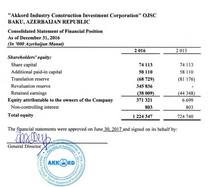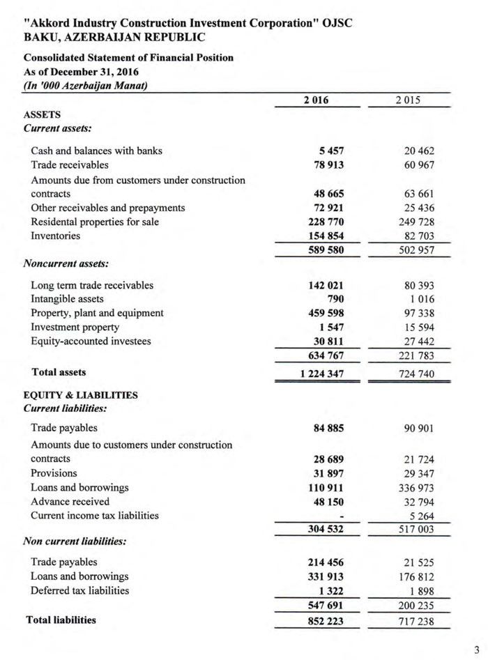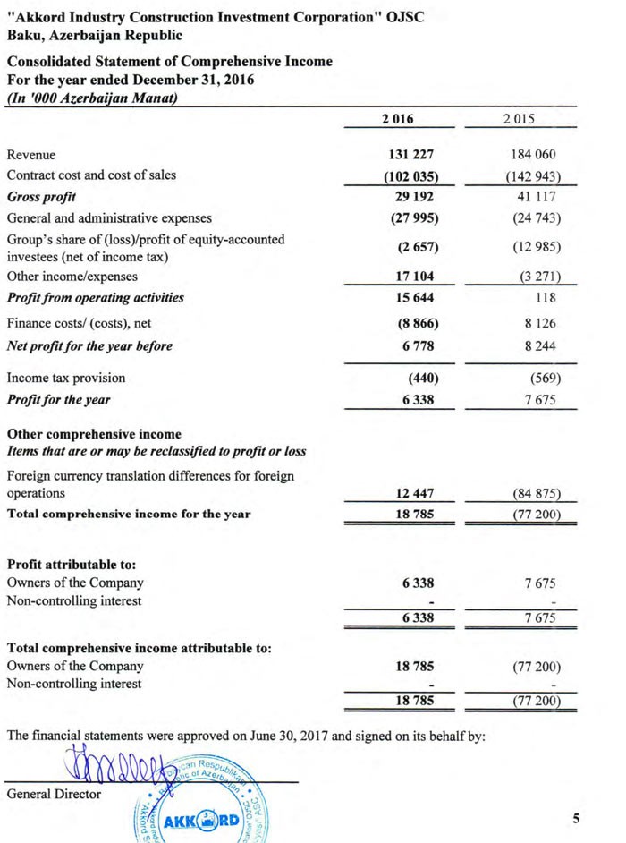 "Akkord Sənaye-Tikinti İnvestisiya Korporasiyası" ASC 2016-cı ildə 18 milyon 785 min manat mənfəət əldə edib. Halbuki əvvəlki il ziyanla (-77,2 milyon manat) işləmişdi.
