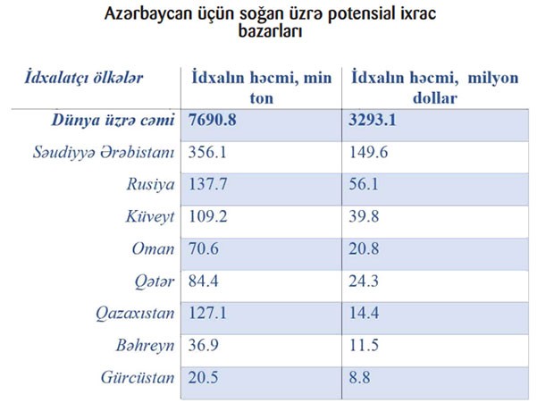 Ötən il soğan ixracının 63 faizindən çoxu Rusiyanın payına düşmüşdür. Mövcud dünya bazar qiymətləri kontekstində Azərbaycandan soğan ixracı, xüsusilə devalvasiyadan sonra, çox perspektivli görünür.