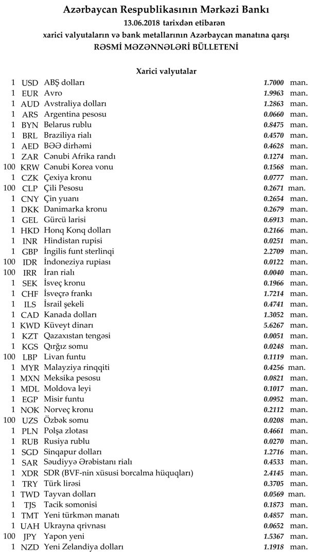 2018-ci ilin İyun ayının 13-nə Mərkəzi Bankın açıqladığı rəsmi Dollar/Manat məzənnəsi İyun ayının 12-si ilə müqayisədə dəyişməyərək 1,7000 manat olub, Avro/manat məzənnəsi 1.9963 manata, Rubl/manat məzənnəsi isə 0,0270 manata düşüb.