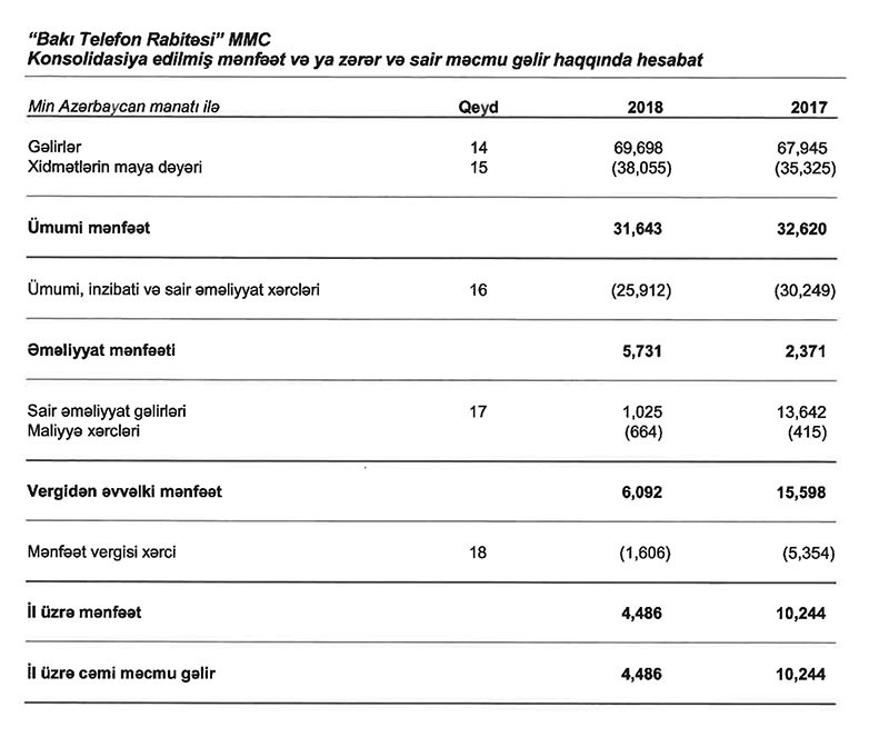 2017-ci illə müqayisədə 2018-ci ildə sair gəlirlərin kəskin azalması “Bakı Telefon Rabitəsi”nin xalis mənfətinin də azalmasına təsir göstərib.