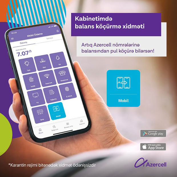 Hazırda koronavirus pandemiyası ilə əlaqədar ölkə ərazisində elan edilmiş xüsusi karantin rejimi dövründə Azercell “Mobil Ödəmə” və “Paycell” xidmətləri vasitəsilə icra edilən balans köçürmələri üçün əlavə xidmət haqqı tətbiq etmir.