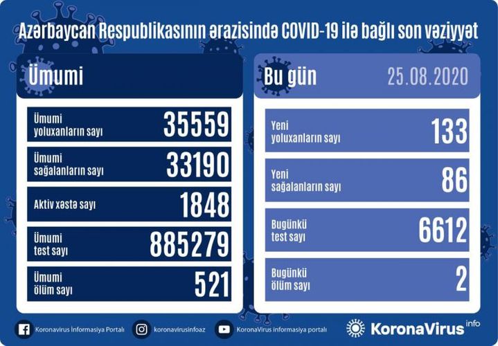 İndiyədək ölkədə ümumilikdə 35 min 559 nəfərin koronavirus infeksiyasına yoluxması faktı müəyyən edilib, onlardan 33 min 190 nəfər müalicə olunaraq sağalıb, 521 nəfər vəfat edib, aktiv xəstə sayı 1 848 nəfərdir.