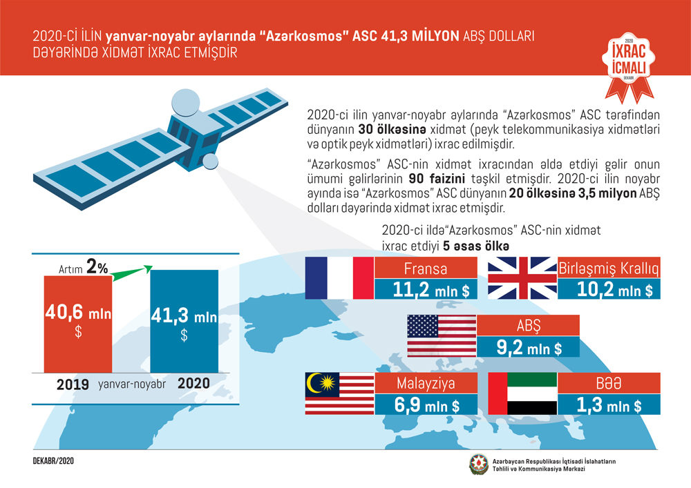 Marja xəbər verir ki 2020-ci ilin yanvar-noyabr aylarında “Azərkosmos” ASC tərəfindən dünyanın 30 ölkəsinə 41,3 milyon ABŞ dolları dəyərində xidmət (peyk telekommunikasiya xidmətləri və optik peyk xidmətləri) ixrac edilib.