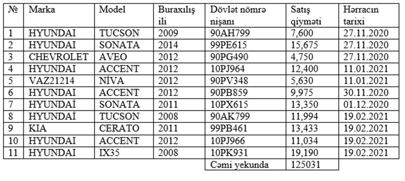 Hərrac yolu ilə artıq satışı həyata keçirilən avtomobillər barədə ətraflı məlumat aşağıdakı cədvəldə təqdim olunmuşdur: