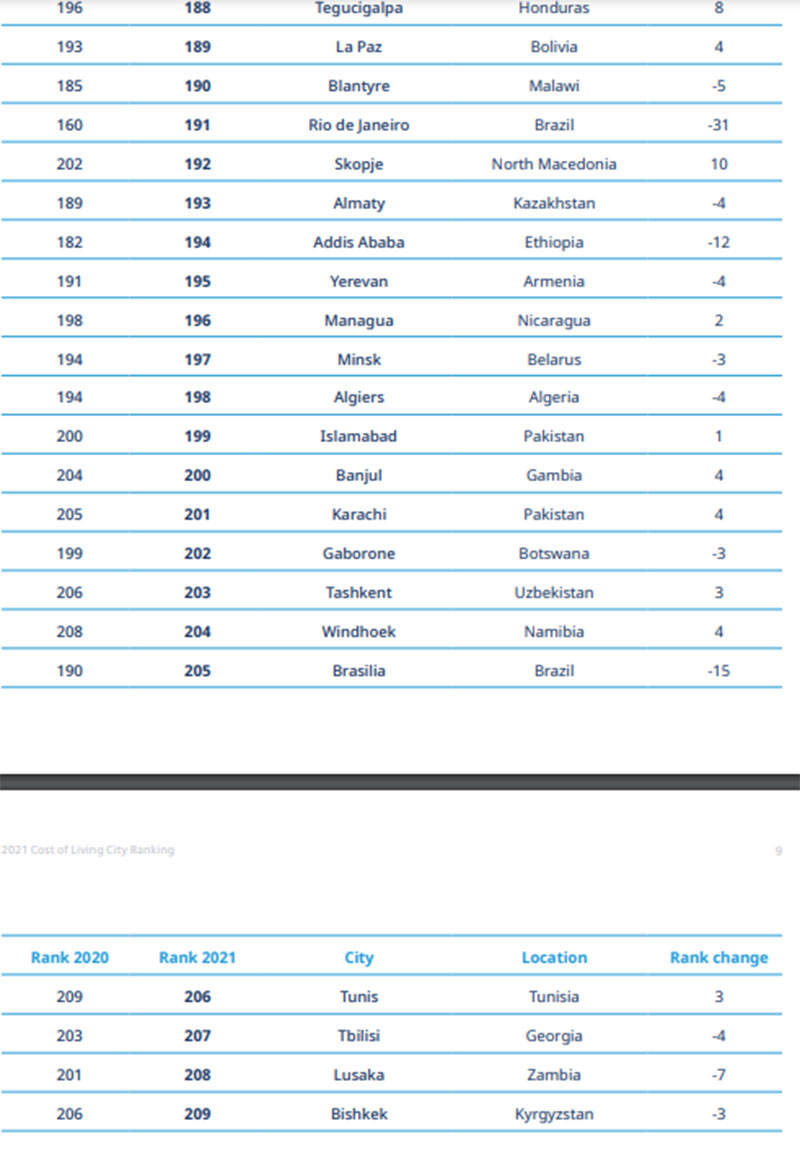 Ən ucuz şəhərlər Bişkek (209), Lusaka (208) və Tbilisidir (207).