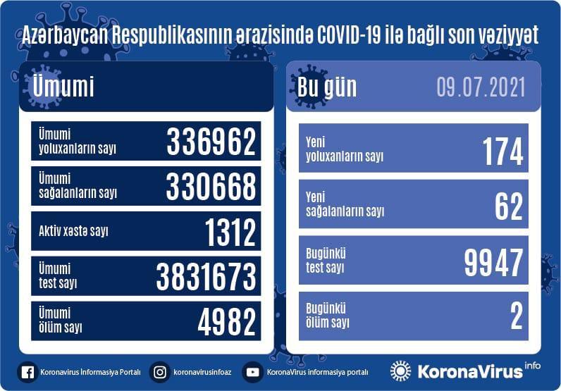 Azərbaycan Respublikasında koronavirus (COVID-19) infeksiyasına 174 yeni yoluxma faktı qeydə alınıb, 62 nəfər müalicə olunaraq sağalıb.