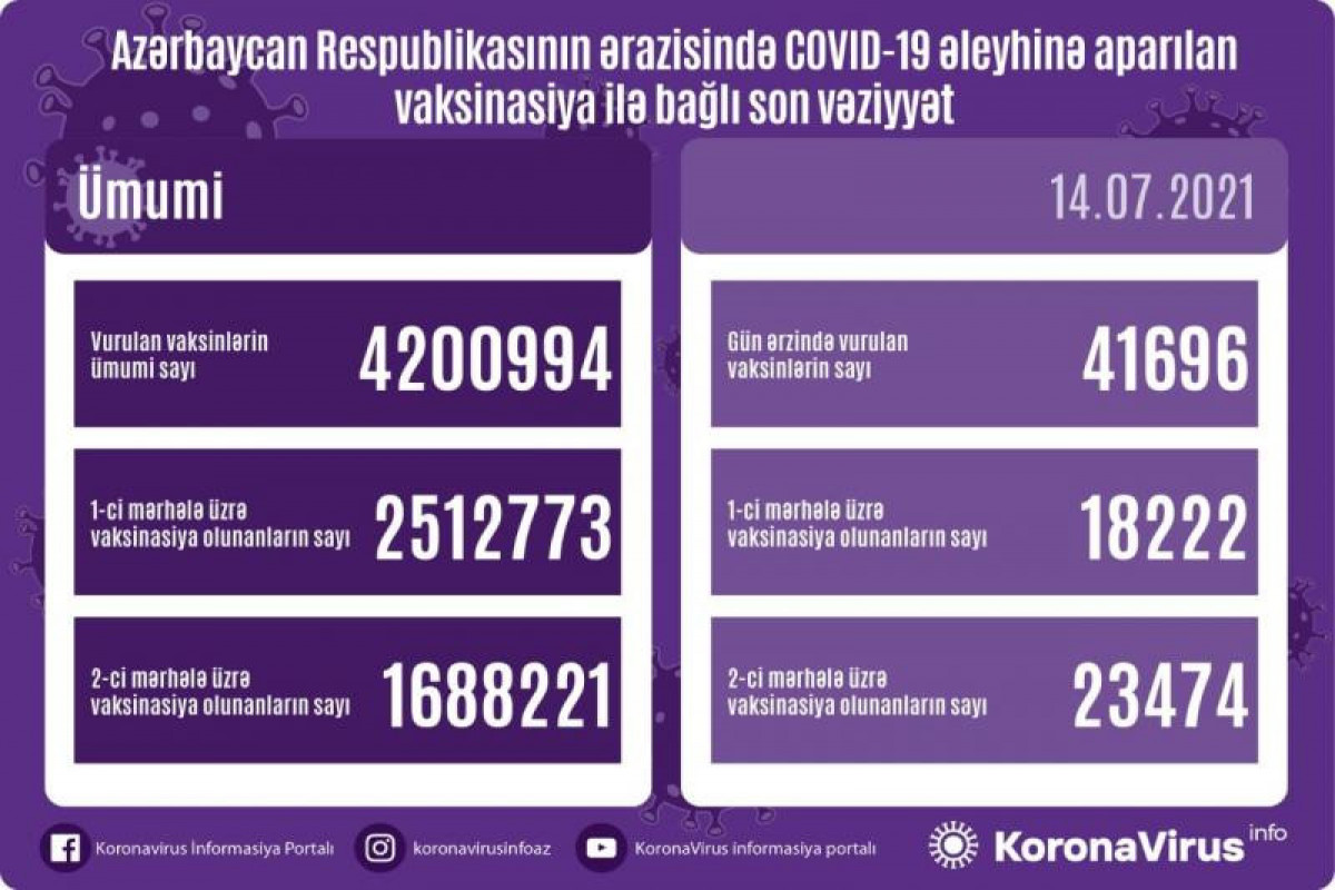 Ölkədə vurulan vaksinlərin ümumi sayı 4 200 994, birinci mərhələ üzrə vaksinasiya olunanların ümumi sayı 2 512 773, ikinci mərhələ üzrə vaksinasiya olunanların sayı isə 1 688 221 təşkil edir.