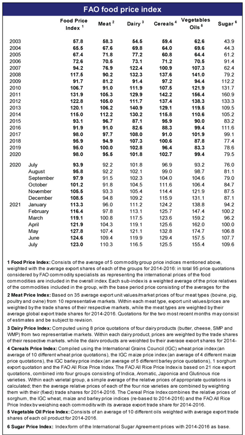 Birləşmiş Millətlər Təşkilatının (BMT) Ərzaq və Kənd Təsərrüfatı Təşkilatının (FAO) məlumatlarına görə, FAO Qida Qiymət İndeksi İyulda aylıq müqayisədə 1,2% düşüb. İndeks ötən ilin eyni dövrü ilə müqayisədə isə 31% yüksəkdir.